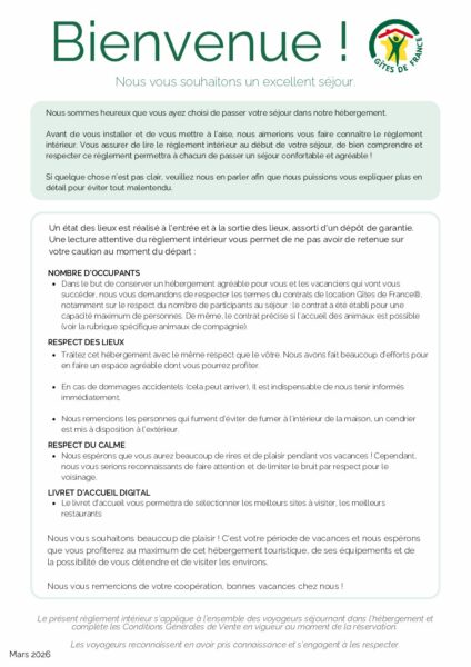Bienvenue dans cet espace pratique pour gérer sereinement votre activité de propriétaire Gîtes de France®. Qu’il s’agisse de démarches administratives, de bonnes pratiques d’accueil, de conseils ou encore de rappels réglementaires, ces documents ont été pensés pour répondre concrètement à vos besoins du quotidien.
